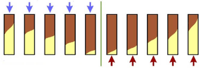 Im ersten Behälter die Kationen--im Austausch zu H+ daher H+ wird in den zweiten